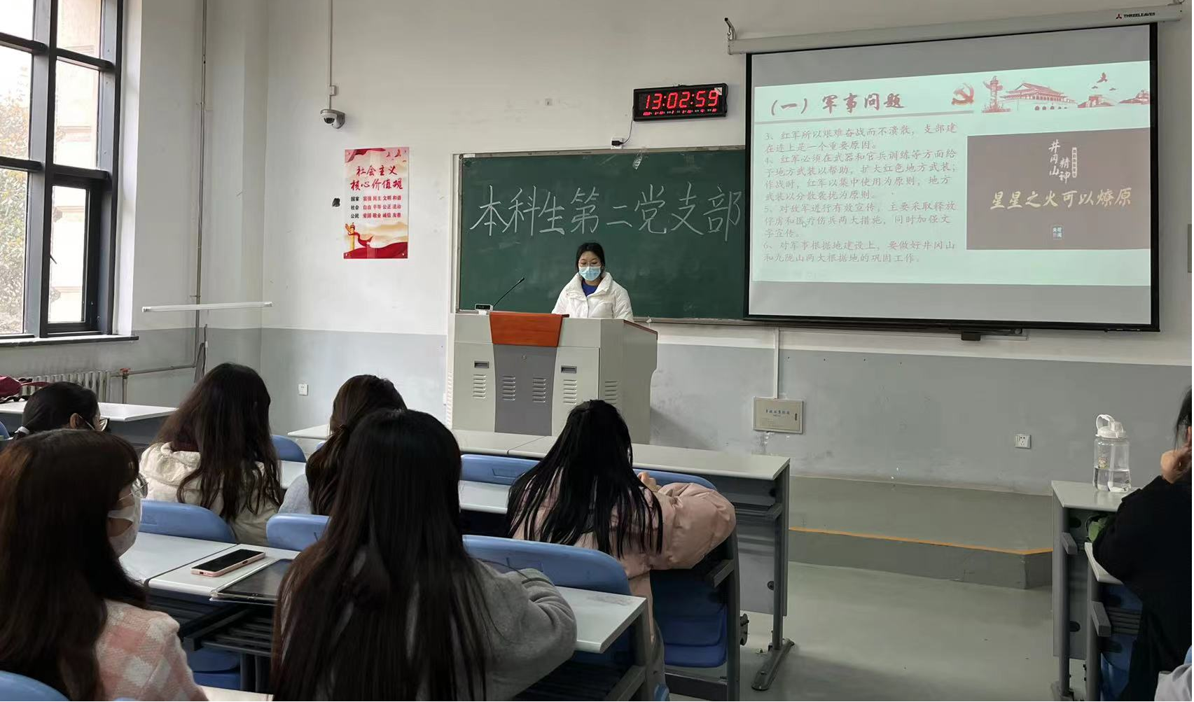 3月22日,本科生第二党支部召开读书分享会,由李梦鸽和闵聪聪两位党员同志为大家分享了《井冈山的斗争》一文。
