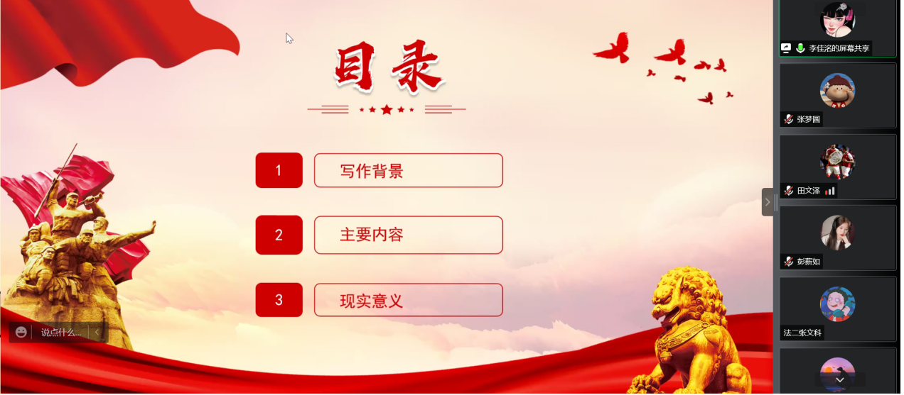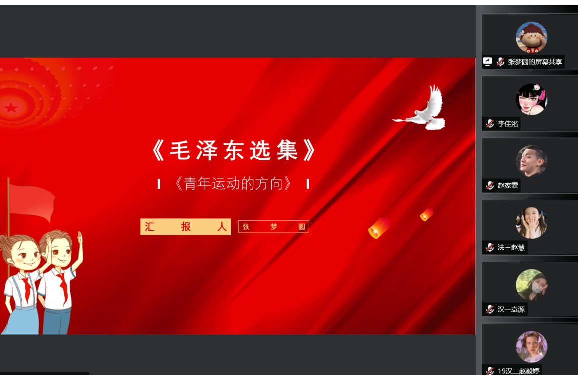 张梦圆同志首先分享了《毛泽东选集》中的《青年运动的方向》,从背景、内容、意义和发展四个方面来开展,主要讲了毛泽东在该文中围绕知识分子、青年学生必须与工农群众相结合这个主题,阐述的四个方面的问题:一是,在对中国国情的系统考察和综合研究的基础上,发展了关于中国革命问题的思想。二是,正确地评价了青年运动在中国革命中的地位和作用。三是,总结了五四运动以来中国青年运动的历史经验教训。四是,指明了中国青年运动的方向。最后以青年最富有朝气、最富有梦想,青年兴则国家兴,青年强则国家强结束了此次分享。