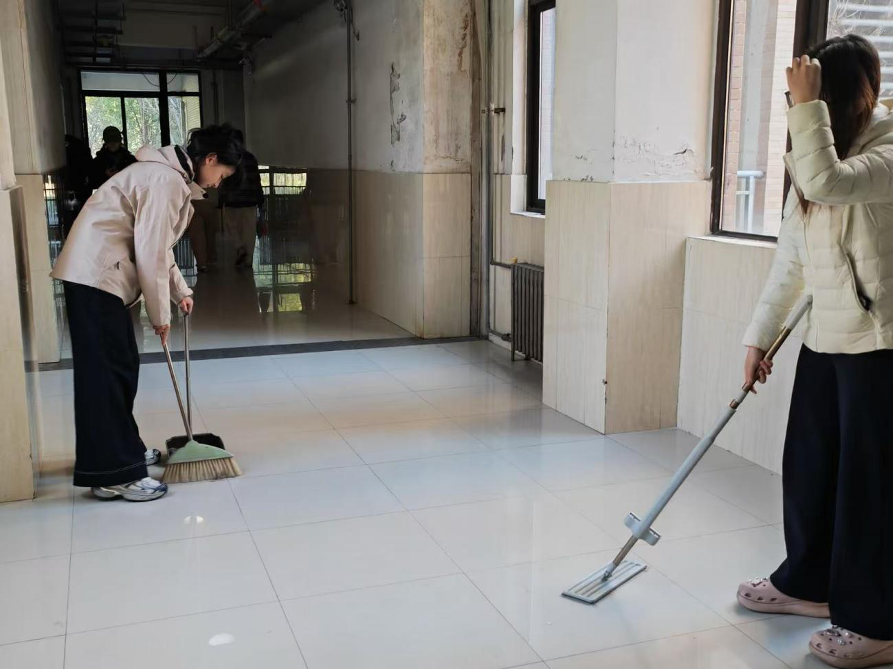 活动中,学生党员明确任务分工,划定责任区域,在了解活动纪律与安全注意事项后,他们手持扫帚、拖把、垃圾袋等工具,有序开展垃圾捡拾、落叶清扫等工作,重点对宿舍楼楼道、洗漱间、窗台等进行全面清理。学生党员们分工协作,不仅改善了宿舍楼卫生环境,还以实际行动诠释党员的责任与担当,充分发挥了党员的先锋模范作用。大家纷纷表示,此次主题党日活动意义深刻,未来将把劳动精神融入日常学习和工作,在服务同学、奉献集体中彰显党员价值。