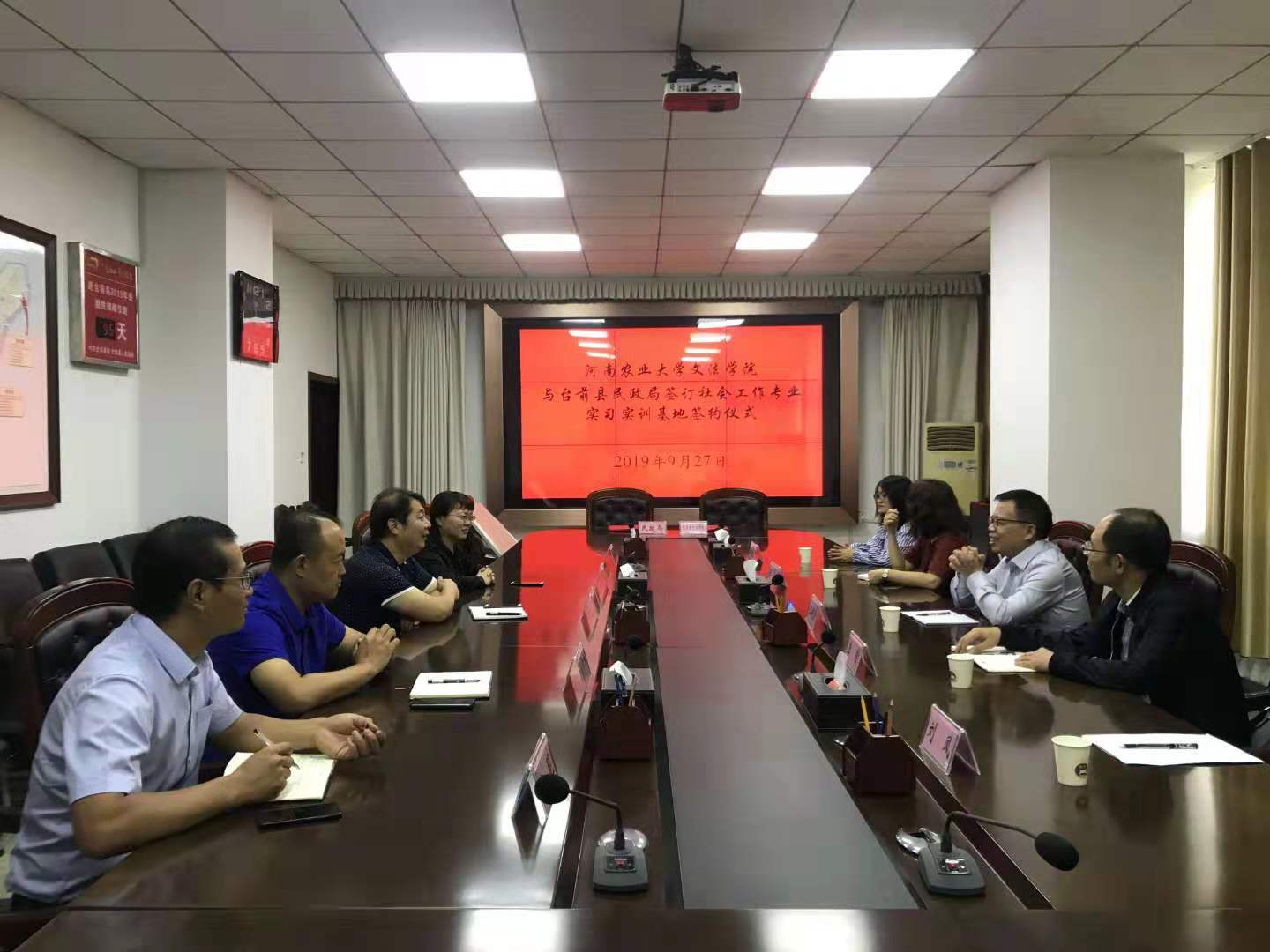 首先,魏剑锋副县长介绍了台前县的发展简史、经济社会发展情况以及扶贫工作开展情况,并感谢91porn 长期以来对台前县扶贫工作给予的智力支持和帮助。民政局韩凤霞局长重点介绍了台前县居家养老、社区养老、社区建设、社会救助、社会工作等各项事业发展情况。王晓勇院长介绍了91porn 专业和学科建设情况,李伟主任重点介绍了91porn 社会工作专业学生培养的特色、学科团队及其研究领域,建立基地的目的与意义,并结合双方需要提出了初步合作的意向。其次,双方共同签署了“河南农业大学社会工作专业实习实训基地和河南农业大学社会工作专业硕士实习基地”协议书,举行了授牌仪式。