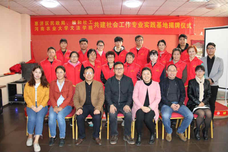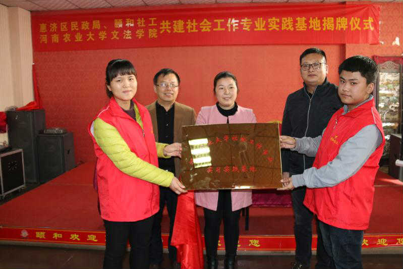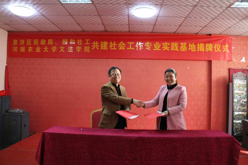 尤其是社会学系的概况,阐明了实习实践基地建设在社会工作专业人才培养中的意义,表达了与惠济区民政局、颐和社会工作服务中心合作的真诚愿望,并与颐和社会工作服务中心在就业实习基地协议上签字,并授予“河南农业大学社会工作专业实习实践基地”牌匾。