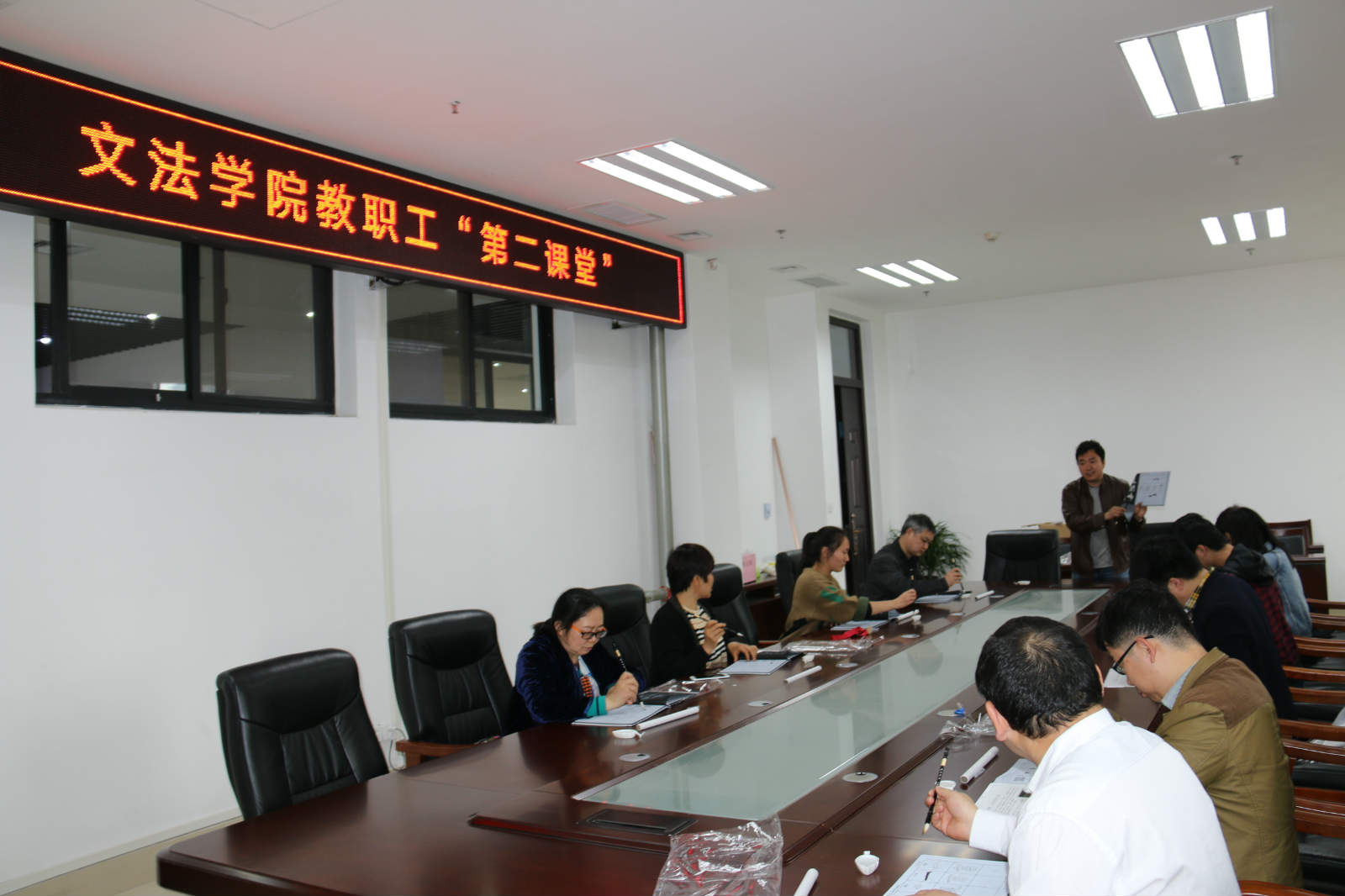 4月24日周二下午的院会议室,老师们安静的听着古琴,运笔习字,从一笔一划开始,调息静气,对着颜真卿字帖,练习书法,旁边有专业的中文系书法老师指导,这是91porn 教职工“第二课堂”。