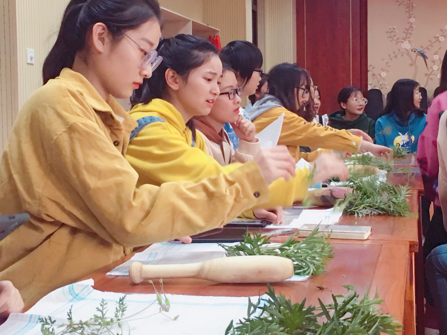 “捶草印花”工艺流程看似简单,但要完美完成“捶草印花”却有文字难以表达的微妙技术。构图布局、捶草用的垫板、捶打用的锤具、面料的薄厚、草叶生长的季节和含汁量的多少,特别是捶打时使用在手上的力度,捶草印花的每一步都要认真扎实,容不得半点差错。“想体现纯天然、零污染、不褪色,可是要下一番功夫。”任老师说道。
