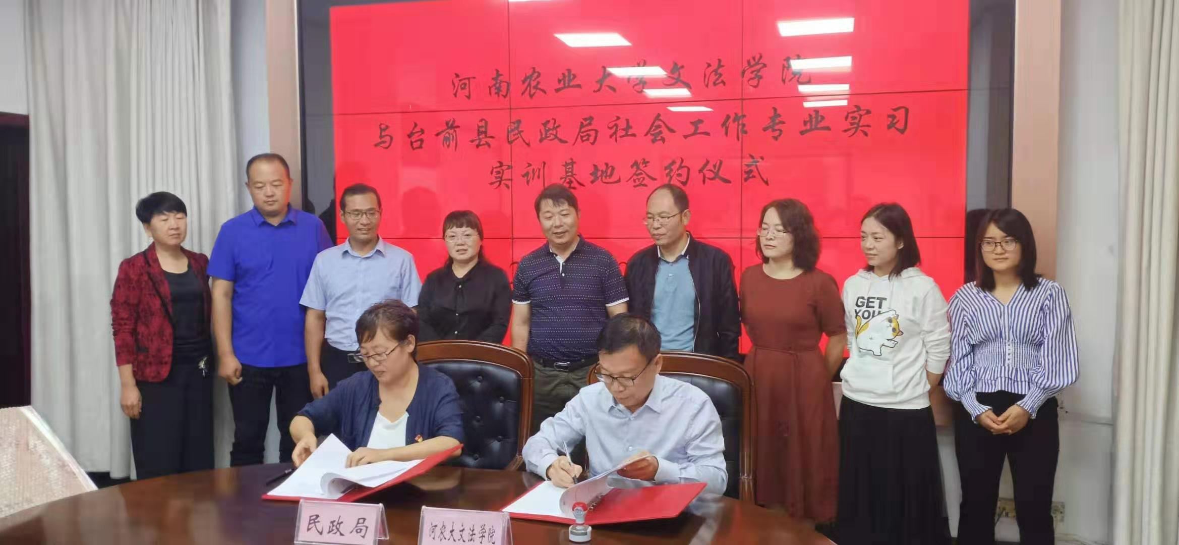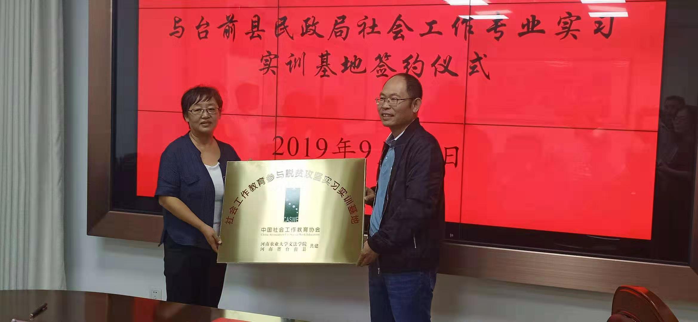 首先,魏剑锋副县长介绍了台前县的发展简史、经济社会发展情况以及扶贫工作开展情况,并感谢91porn 长期以来对台前县扶贫工作给予的智力支持和帮助。民政局韩凤霞局长重点介绍了台前县居家养老、社区养老、社区建设、社会救助、社会工作等各项事业发展情况。王晓勇院长介绍了91porn 专业和学科建设情况,李伟主任重点介绍了91porn 社会工作专业学生培养的特色、学科团队及其研究领域,建立基地的目的与意义,并结合双方需要提出了初步合作的意向。其次,双方共同签署了“河南农业大学社会工作专业实习实训基地和河南农业大学社会工作专业硕士实习基地”协议书,举行了授牌仪式。