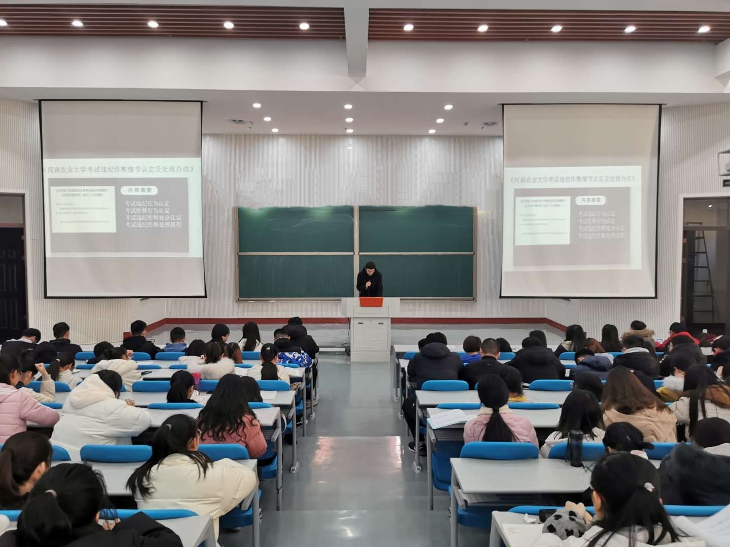 会议伊始,辅导员王鹏举列举了上海某高校学生因作弊被开除学籍的案例,讲解诚信考试的重要性及考试作弊的严重后果。接着,两位学生代表宣读《河南农业大学考试纪律作弊情节认定及处理办法》,带领大家学习学校关于考试纪律的详细要求,最后,王鹏举呼吁所有学生要以诚信考试为荣,考试作弊为耻,要求所有同学签订《诚信考试承诺书》,参会同学均表示在考试期间一定自觉遵守考试纪律,严格履行承诺,做一个诚实守信的大学生。