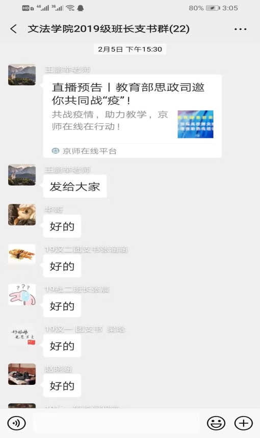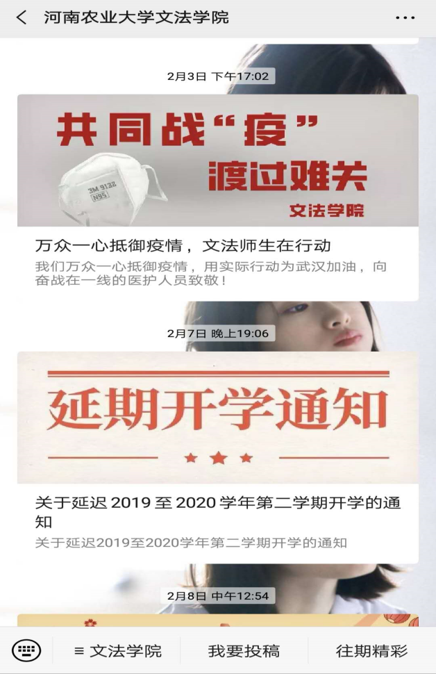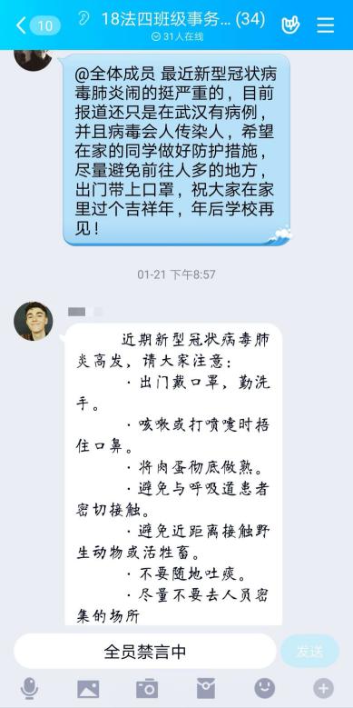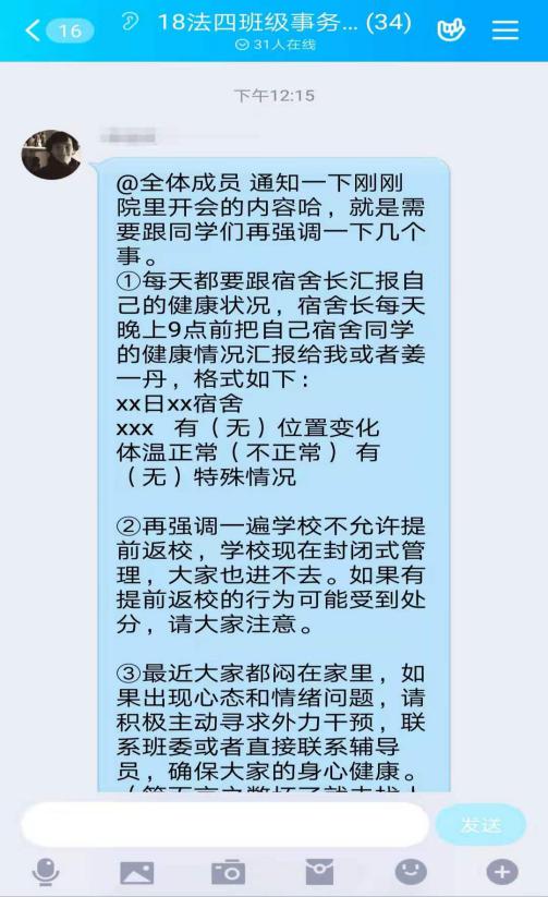 通过年级辅导员、班主任、班长、团支书、宿舍长等多层次多渠道方式,通过微信、 qq工作群、官网、新媒体等方式,将《关于寒假学生返校事宜的紧急通知》《关于延迟2019-2020学年第二学期开学的通知》告知给每一位师生,及时向学生传达学校目前已进行半封闭管理,未到开学时间严禁学生提前返校的通知。通过对师生的线上宣传教育,动员91porn 师生积极配合学校各项防控措施,主动向班级、单位报告假期行踪和身体健康状况,提高自觉防控意识和能力。
