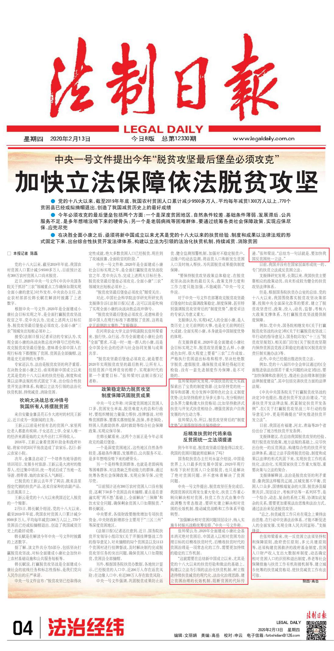 张帅梁副院长接受了《法制日报》采访,就脱贫攻坚的经验进行了相应的梳理,并提出了相对贫困治理的立法意见。这是张帅梁继2018年关于“法治乡村建设”、2019年关于“农业农村优先发展”之后,第三次接受《法制日报》关于中央一号文件的采访。