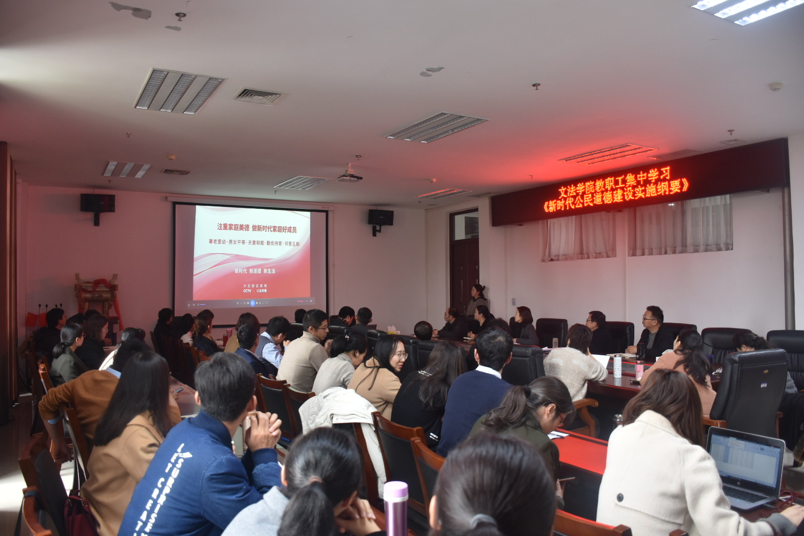 召开全体教职工大会集中学习《新时代公民道德实施纲要》,学院党委书记牛娟进行领学。