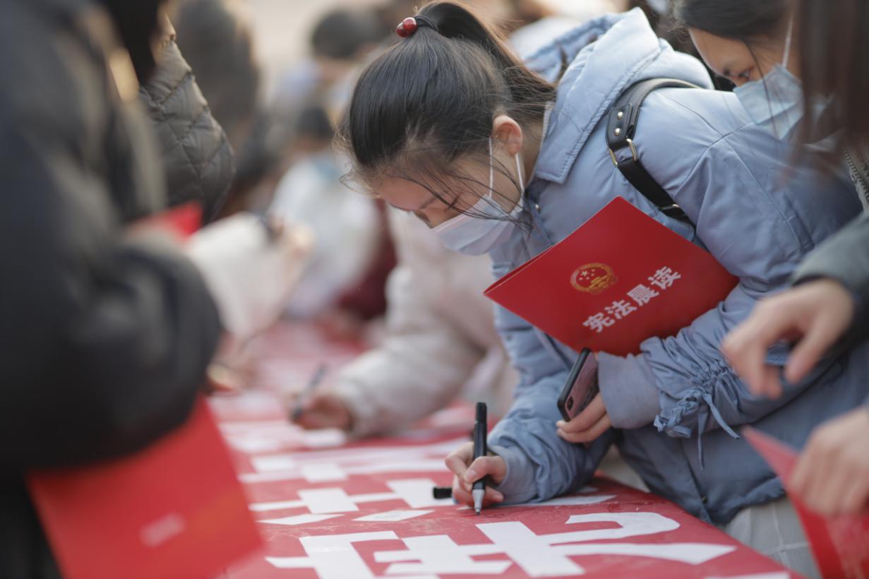 活动最后,与会师生在《宪法伴我们成长》的乐曲声中郑重签上自己的名字,表达对宪法的坚定信仰和崇敬之情。