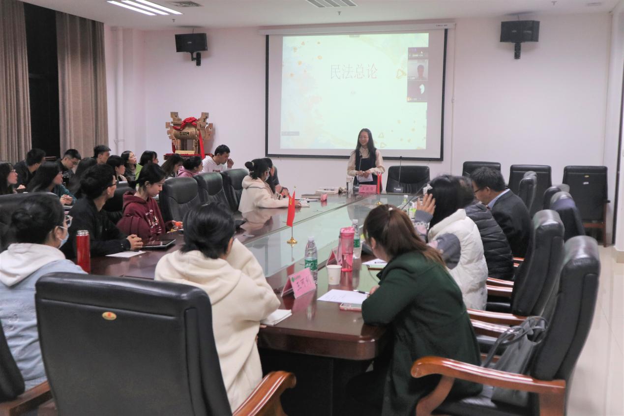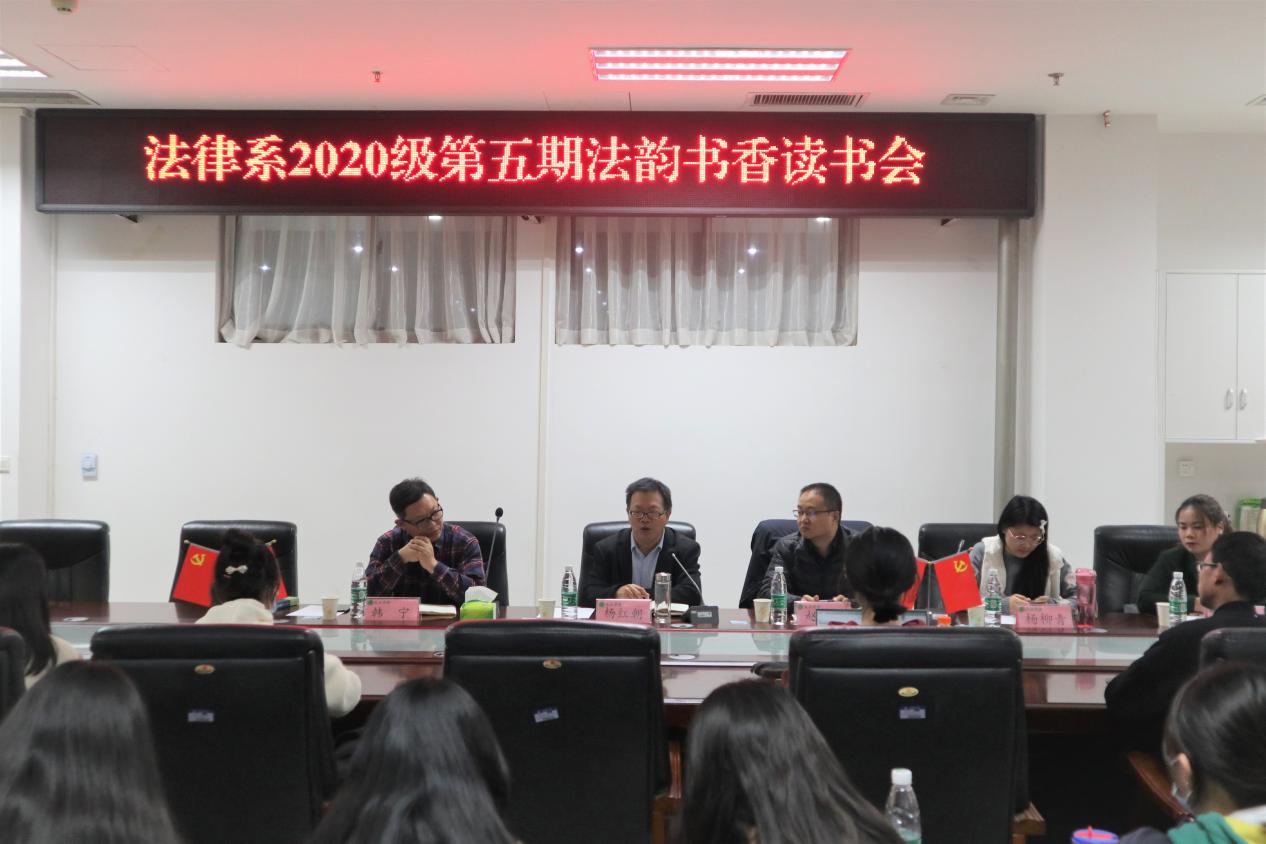 法律系优秀毕业生刘振轩学长做点评和分享,会议由2020级法学二班班主任杨柳青主持,副院长杨红朝、法律系主任韩宁及法律系部分教师和法学专业学生代表参加读书会。