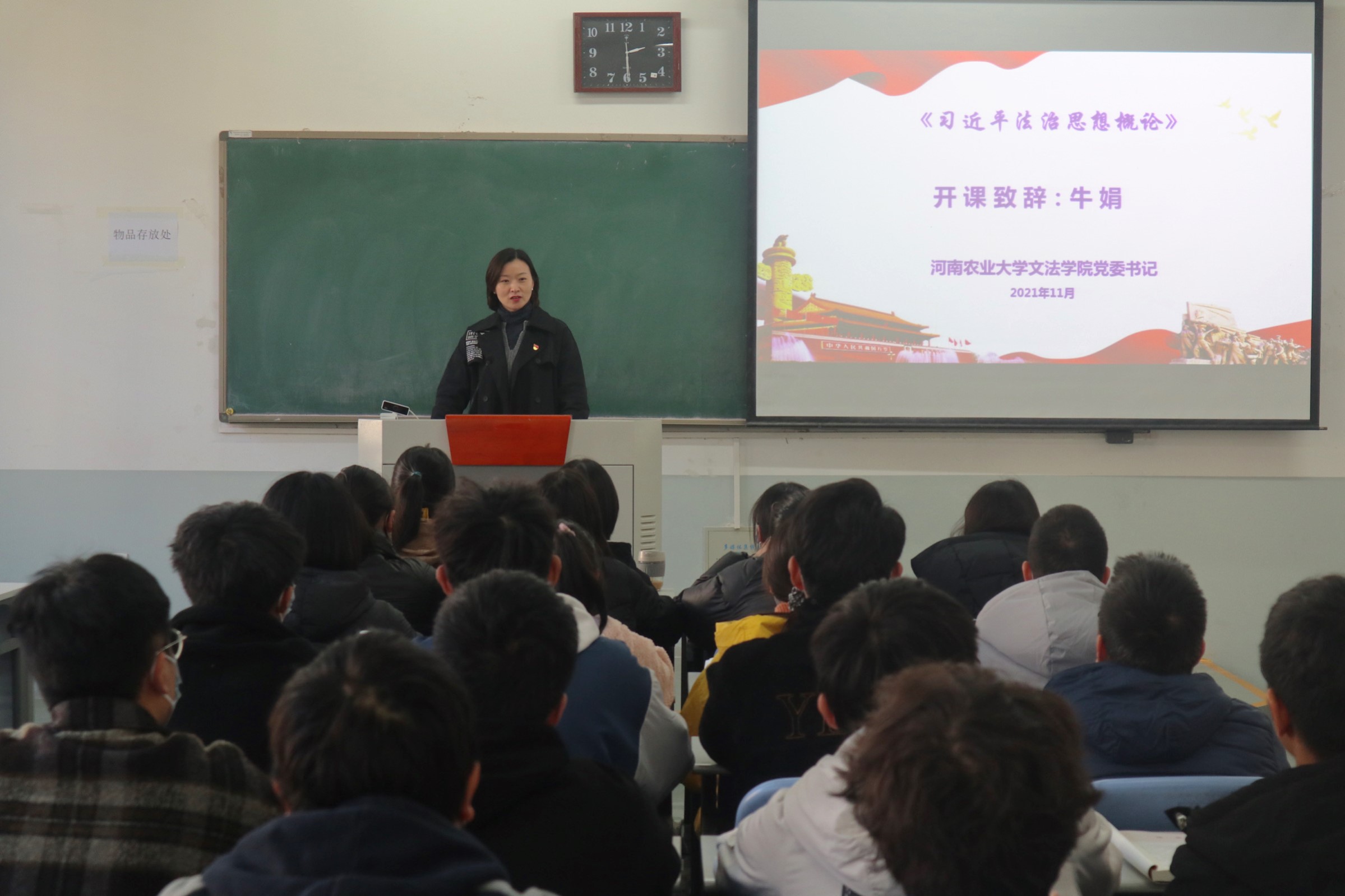 11月8日,《习近平法治思想概论》课程在91porn 正式开课。院党委书记牛娟作开课致辞,她指出,从当前到本世纪中叶的未来30年,是中华民族全面建成社会主义现代化强国的关键期,也是全面建设法治中国的攻坚期。以习近平同志为核心的党中央创立的习近平法治思想,科学指明了“中国号”法治巨轮的前进方向,系统提出了全面依法治国的总蓝图、路线图、施工图,是党领导人民全面建设良法善治法治中国的科学行动指南。为推动这一科学理论体系更好地被广大干部群众,特别是法学类专业学生所学习掌握,特开设这一课程。
