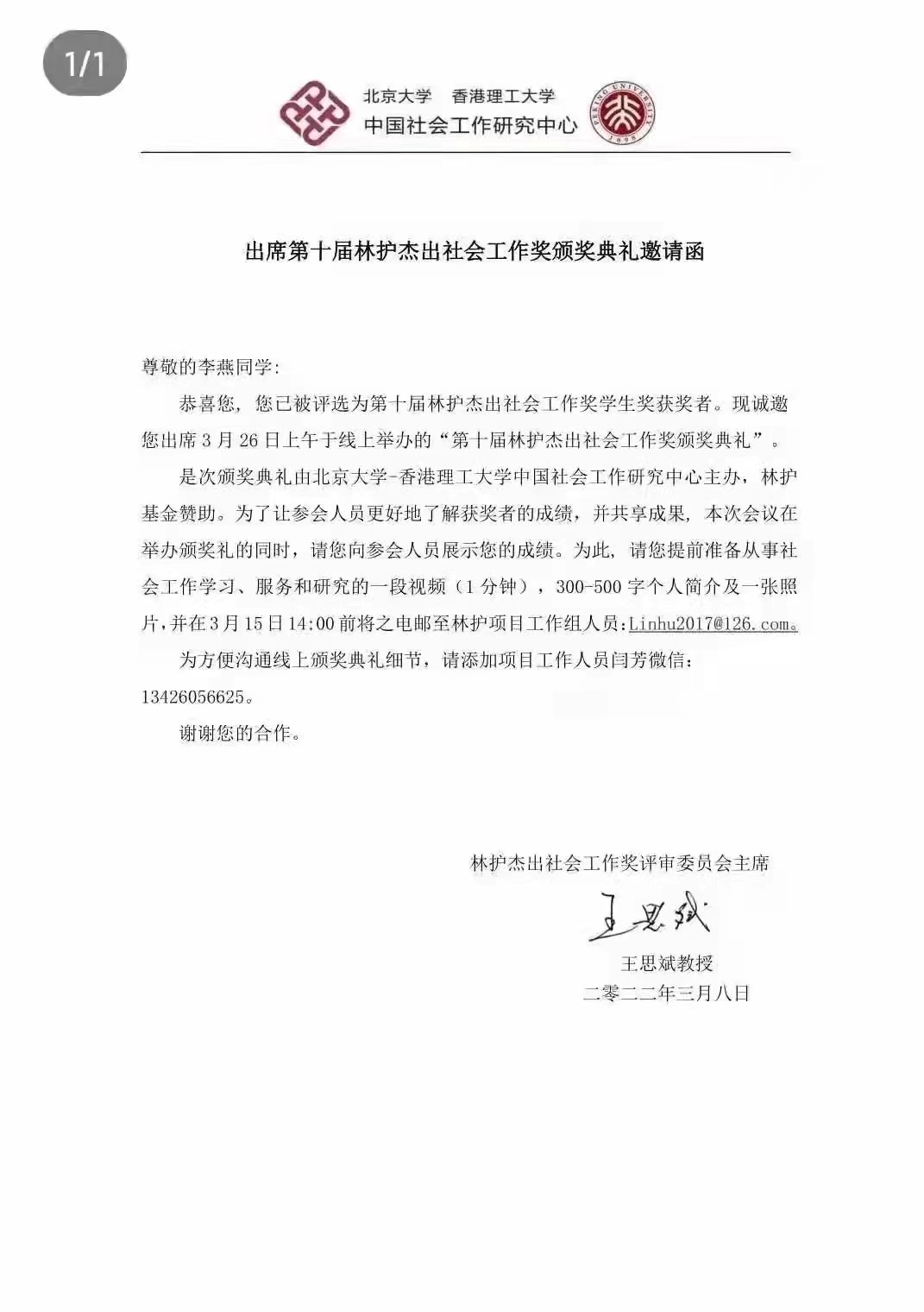 据悉,“林护杰出社会工作奖”是“林护社会工作培训及发展基金”的子项目,由香港林护基金会设立,香港理工大学应用社会科学学系和北京大学社会学系联合举办,旨在奖励中国大陆地区在社会工作教育、社会工作服务管理和实务工作领域做出卓越贡献的学者、学生和服务项目,以提升社会工作的专业化水平,促进中国大陆地区专业社会工作教育和社会工作实务的发展,从而承担起社会工作专业的社会责任。(文/赵梦闪 图/李想)