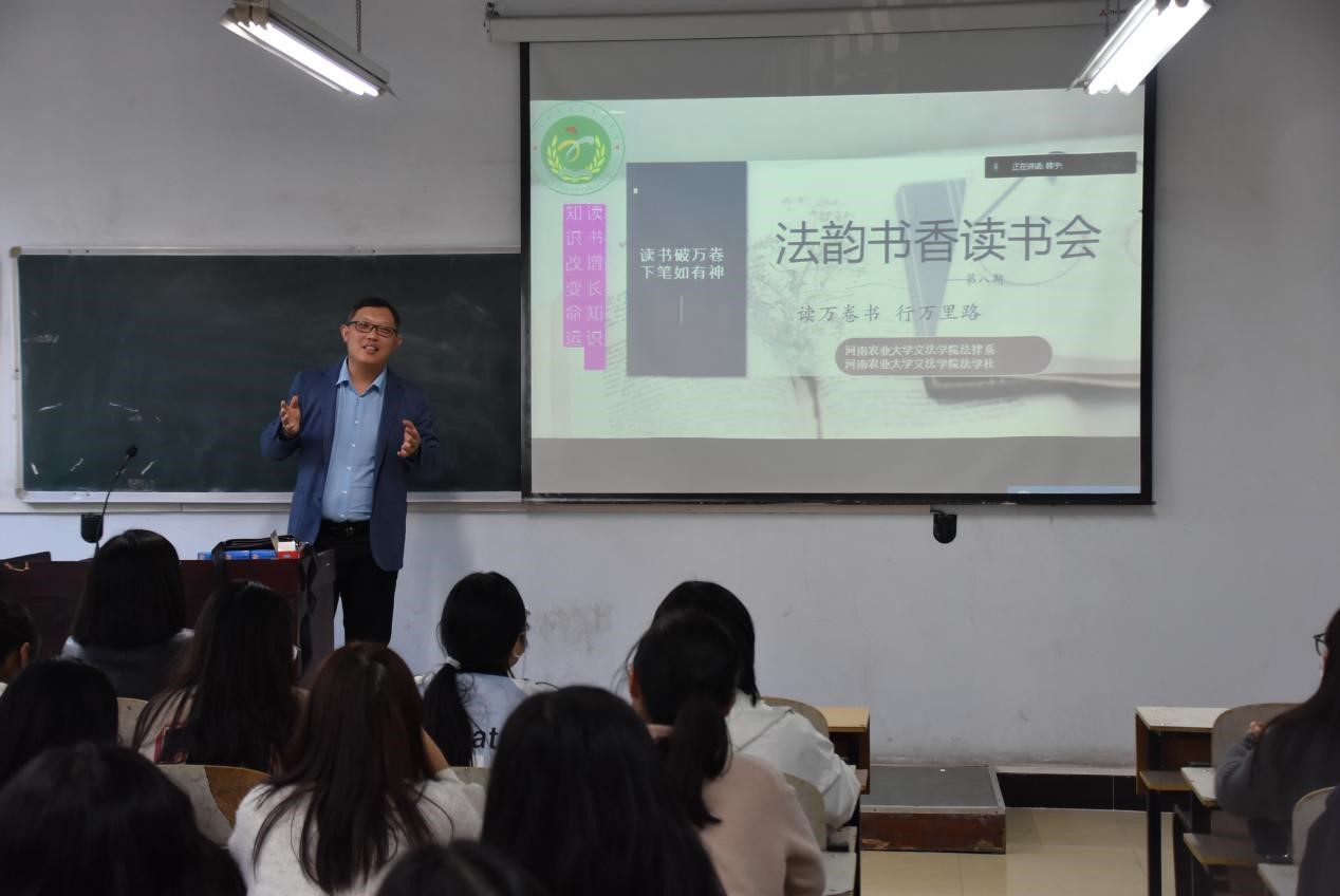 在桃李园举办第八期法韵书香读书会。法律系教师韩宁、王可利、贾秋宇及2022级法学专业新生参加读书会,会议由法律系主任韩宁主持。