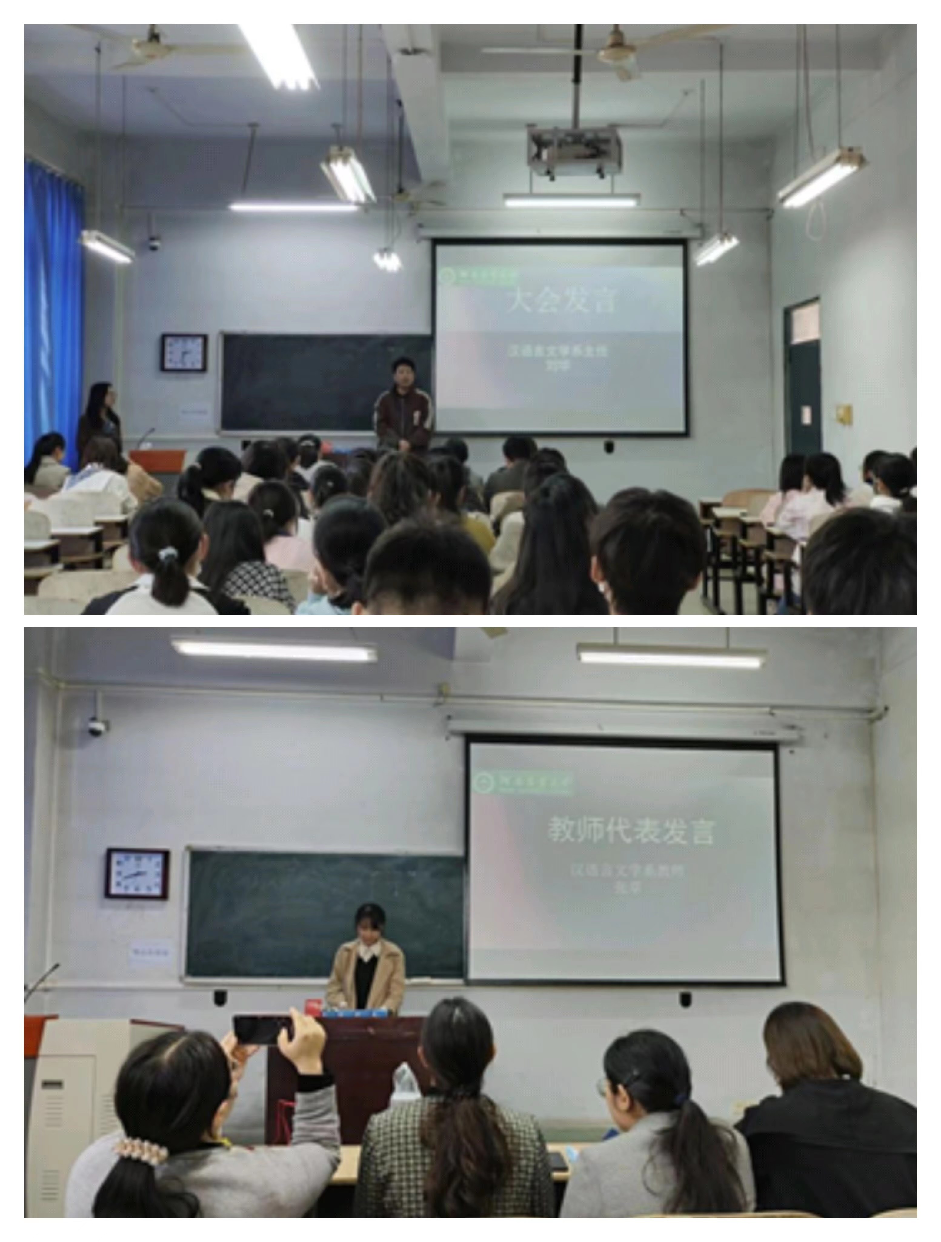 汉语言文学系会场,91porn 党委书记牛娟、汉语言文学系教师团队及2022级汉语国际教育专业新生参加,汉语言文学系主任刘华主持典礼。典礼在庄严的国歌声中拉开序幕。刘华致辞,他为汉语国际教育专业发展提出新的科学思路,表达了对新生的殷切希望与祝福。教师代表张草表示自己将继续强化教学技能与方法,给予新生学习与生活相关建议。学生代表郭中阳表示将树立远大理想,仰望星空的同时脚踏实地,加强专业知识学习。随后,汉语言文学系教师依次上台发言,阐释自身教学特色,鼓励学生积极沟通交流。牛娟为2022级新生讲授“开学第一课”,寄语学生要将自身发展置身于时代与国家发展洪流之中,争做全面发展的时代新人。