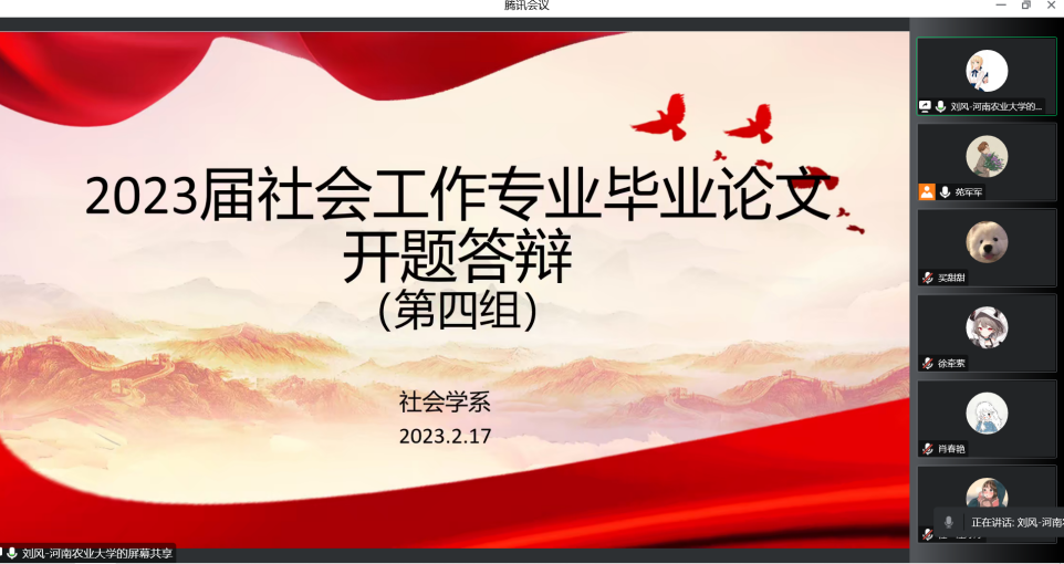 2月17日,按照学院本科毕业论文工作安排,社会学系组织2023届社会工作专业本科生进行毕业论文开题答辩。参加开题答辩的有84名2023届社会工作专业本科生和17位本科毕业论文指导老师,共分为五个答辩组,每个答辩组3-4位指导老师,采用线上方式进行。