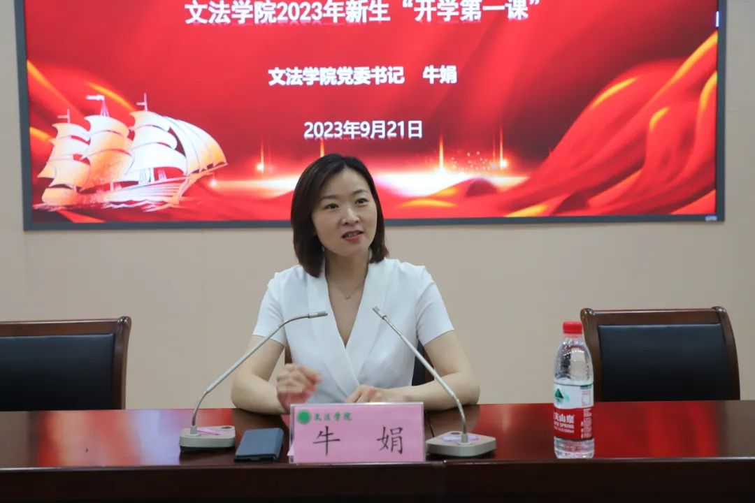 牛娟以河南农业大学校庆宣传片《追光》为切入点,结合中国近现代史与河南农业大省的特点,阐述了河南农业大学以及91porn 的起源和发展历程。随后,她通过提问的方式将课程分为两大部分,即“力从何来”、“帆向何处”。她通过回顾红船精神、时政热点,并结合第二个百年奋斗目标,呼吁同学们应当汲取信仰、爱国、责任之力,接过时代的接力棒,为实现中国式社会主义现代化强国,贡献自己的力量。与此同时,她结合日常学习生活向同学们详细介绍了各个专业的发展概况以及就业前景,告诉大家要向专业、梦想、复兴之巅扬帆。课程结束时,她寄语全体学生,中华民族伟大复兴既是国家、民族的目标,也是我们每个人的目标,要将时间和精力放在提升自身上,认真学习,为个人梦想与国家发展助力。