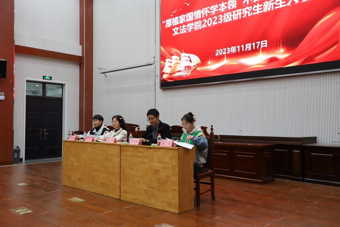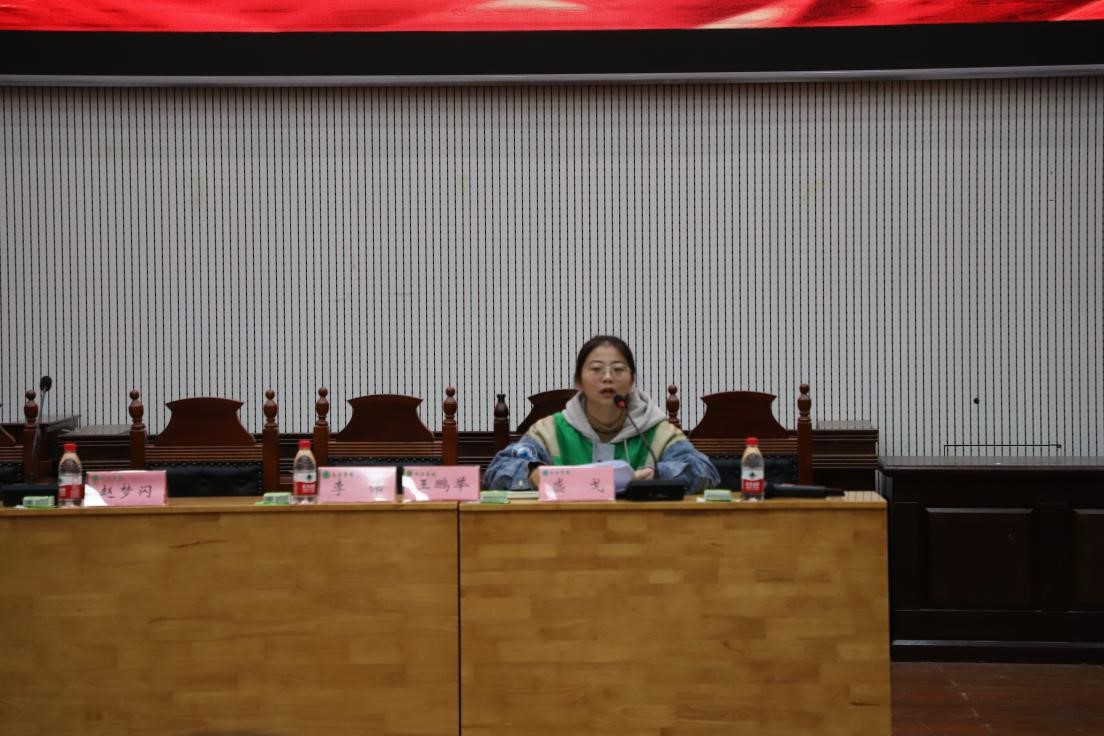 在模拟法庭举行“厚植家国情怀学本领,不负时代重托勇担当”2023级研究生新生入学教育系列活动。学院团委全体辅导员以及2023级全体研究生参加会议。会议由辅导员王卓锐主持。