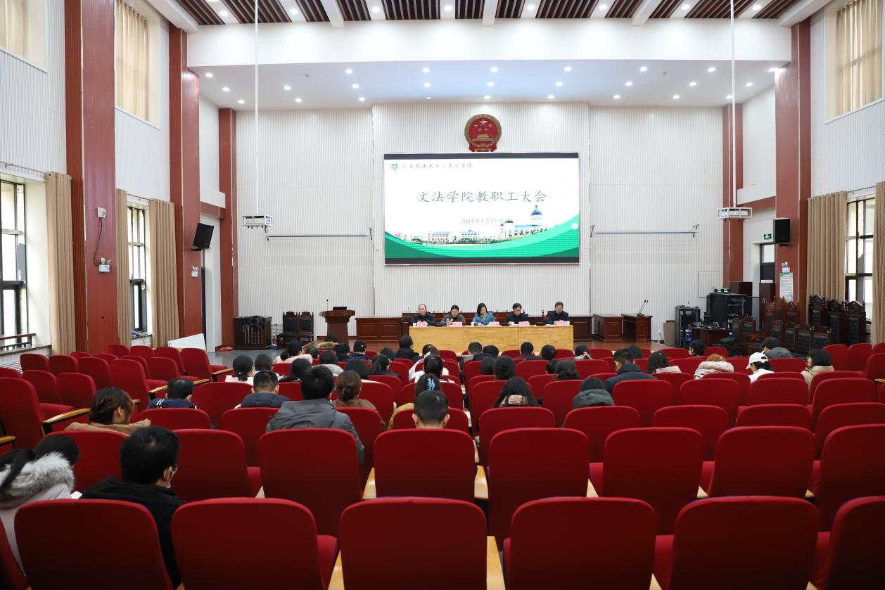 在模拟法庭举行全体教职工大会。学院领导班子及全体教职工参会,会议由学院党委书记牛娟主持。