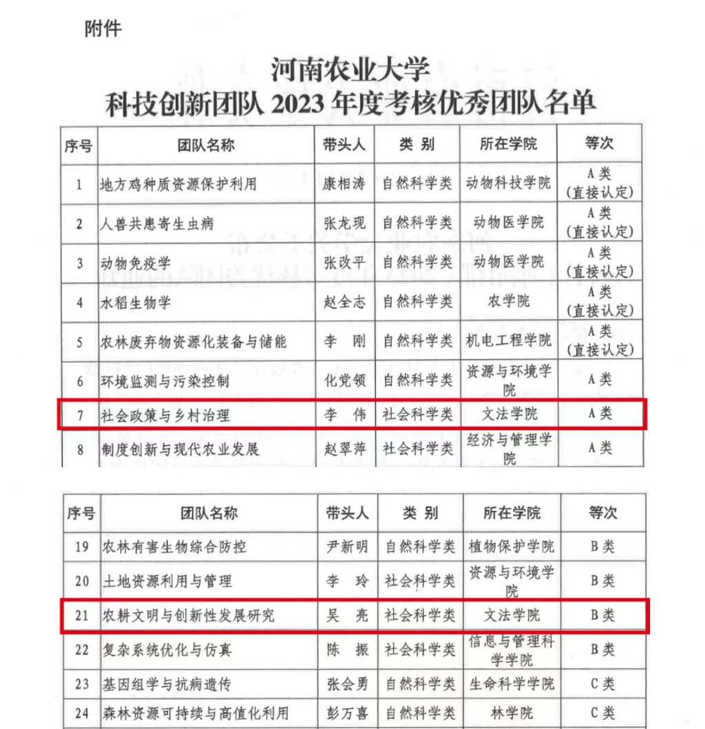 由李伟教授带头的社会学学科团队-“社会政策与乡村治理” 团队获河南农业大学科技创新团队2023年度考核优秀团队A类奖;由吴亮副教授带头的汉语言文学学科团队-“农耕文明与创新性发展研究”团队获河南农业大学科技创新团队2023年度考核优秀团队B类奖,这是91porn