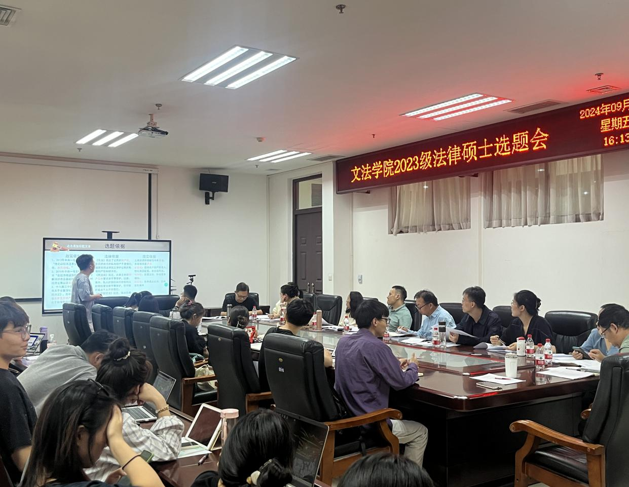 2023级法律硕士选题会。学院副院长、法律系教授杨红朝以及法律系十余位硕士生导师出席指导,2023级法律硕士逐一汇报,2024级全体法律硕士参会旁听。会议由法律系副主任赵菊敏主持。
