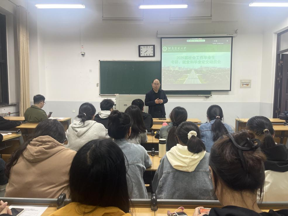 本网讯(通讯员 苏迪)为进一步落实毕业生就业、毕业论文等工作,社会学系于10月18日晚在龙子湖校区繁塔楼D203召开“2025届社会工作毕业生考研、就业和毕业论文动员会”。副院长李伟、社会学系主任刘风、社会学系部分教师、龙子湖校区和许昌校区2025届社会工作专业全体毕业生参加了此次动员会。会议由苏迪主持。