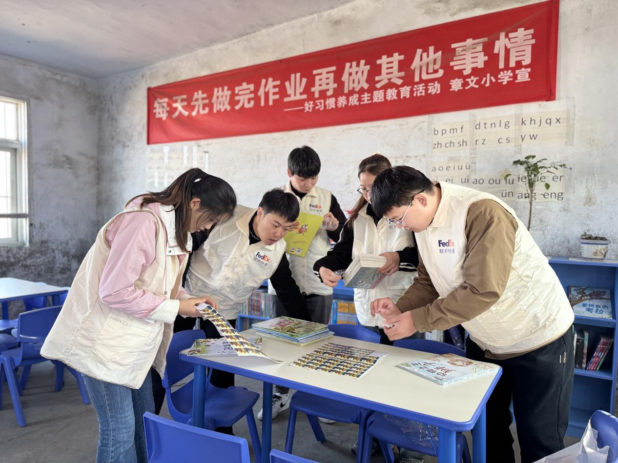 志愿者们整理图书阅览室书籍