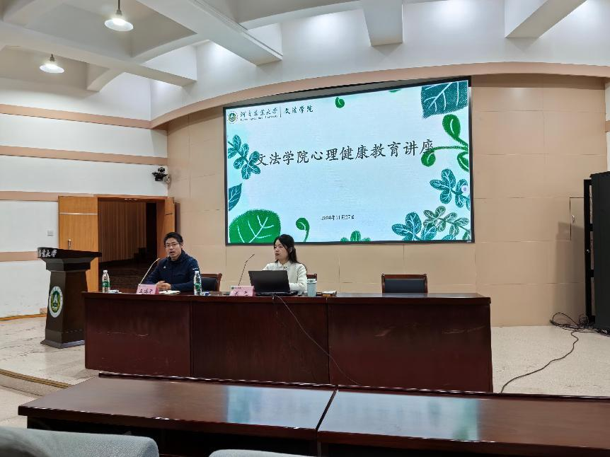 于文化路300人报告厅举办2024级新生心理健康教育讲座,本次讲座邀请学校心理健康教育中心专职教师关元作为主讲老师,学院团委书记王鹏举主持。