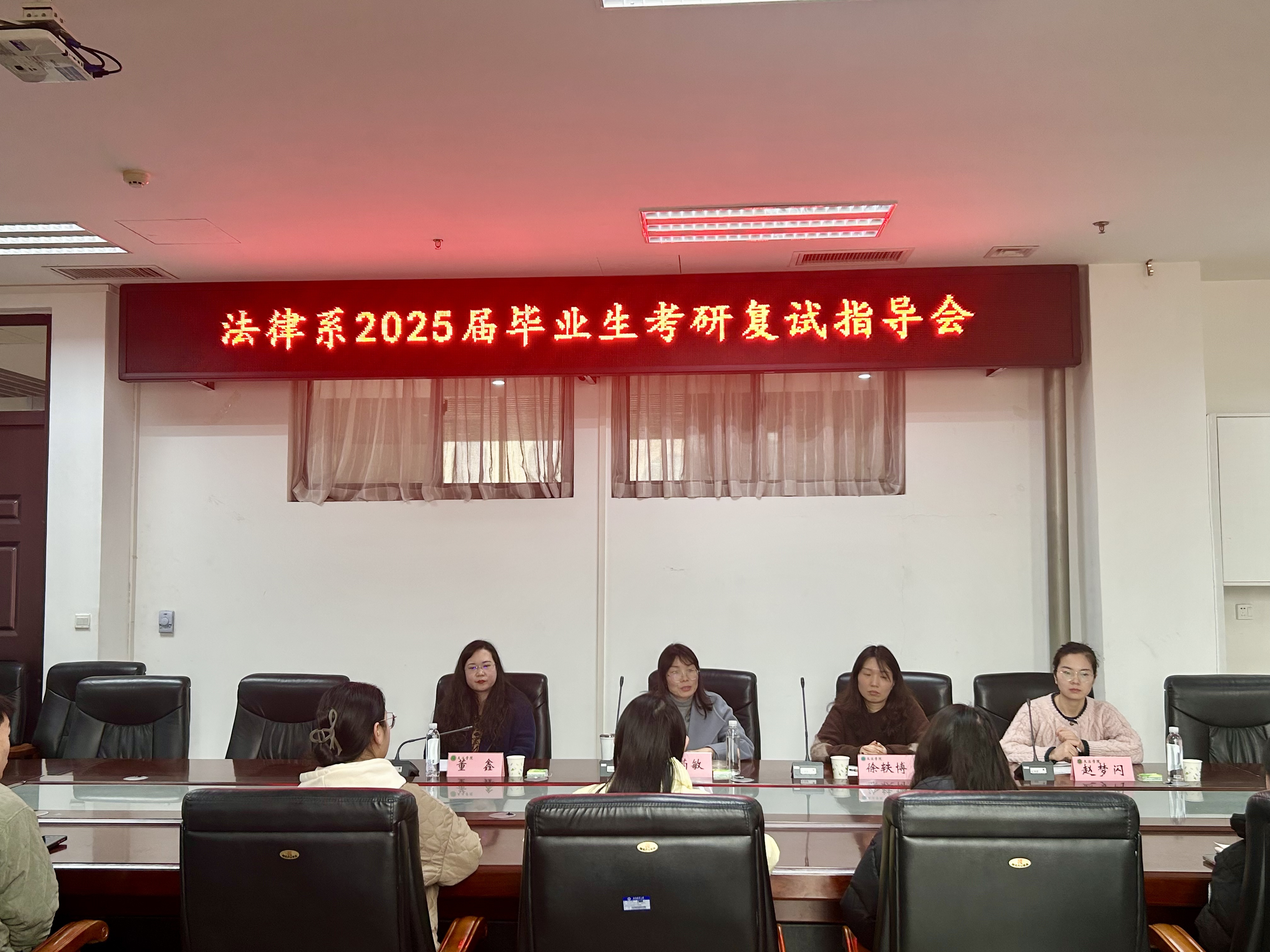 于龙子湖校区繁塔楼A310举办法律系2025届毕业生考研复试指导会。会议由团委副书记赵梦闪主持,法律系副主任赵菊敏、法律系教师徐轶博、法律系教师董鑫出席并作指导,现场气氛热烈,毕业生积极参与。