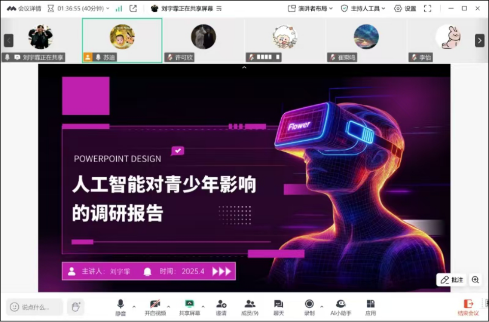 交流现场气氛融洽且热烈,同学们依次通过PPT展示寒假调研的成果。汇报内容围绕技术使用差异、家庭引导策略、教育资源配置等核心议题展开,大家坦率分享了各自在调研中遇到的棘手问题与克服挑战的心路历程,同时畅谈了此次实践活动带来的深刻收获和成长体验,并对调研过程中存在的不足进行了深刻反思。