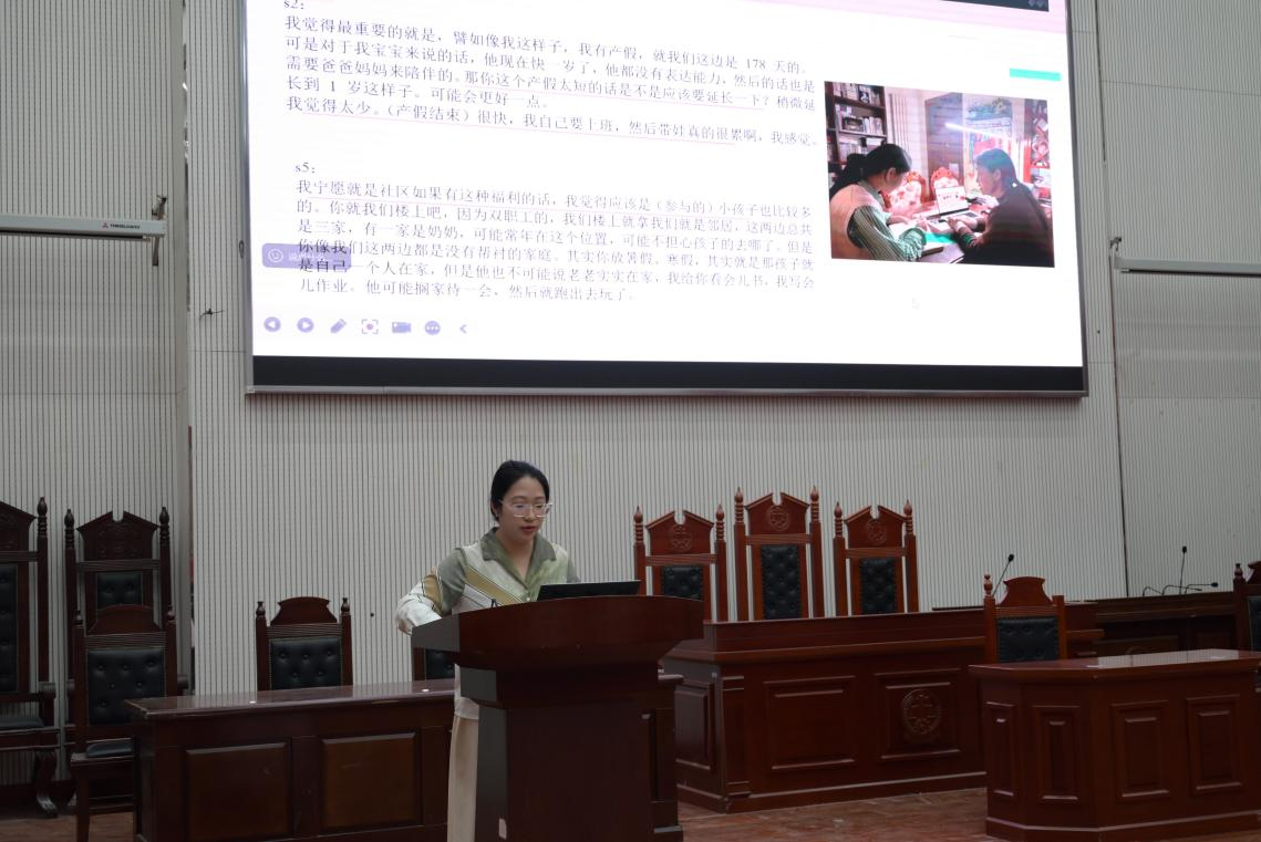 活动伊始,五名学生代表依次登台,分享了各自的调研成果。赵辛悦围绕城市社区公共共享空间建设展开汇报,深入探讨了社区公共空间的使用现状、存在问题及优化策略;曾格聚焦青年女性养育现状和养育心理研究,通过详实的调研数据和案例分析,揭示了青年女性在养育过程中面临的养育压力,并提出通过家庭支持、职业支持、社会支持和政策支持构建生育友好型社会。刘雨希聚焦人工智能对儿童社会认知发展的影响状况,提出了具有前瞻性的观点和建议。寇寒冰针对外出务工返乡情况以及农村闲置资产盘活进行汇报,为农村经济发展提供了新思路;申梦媛则通过对农村“90后”“00后”婚恋观的调查,展现了新时代农村青年婚恋观念的变化趋势。学生们的汇报内容丰富、逻辑严谨,充分展示了扎实的专业素养和深入的思考能力。