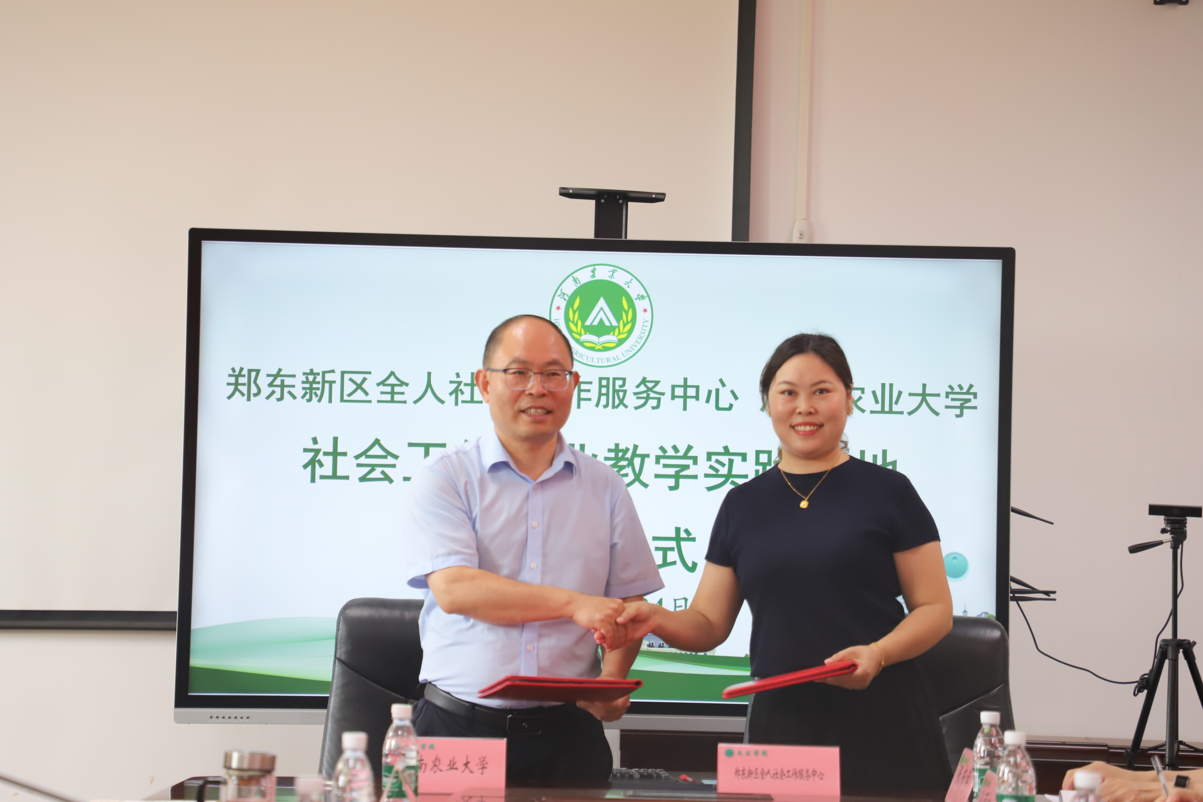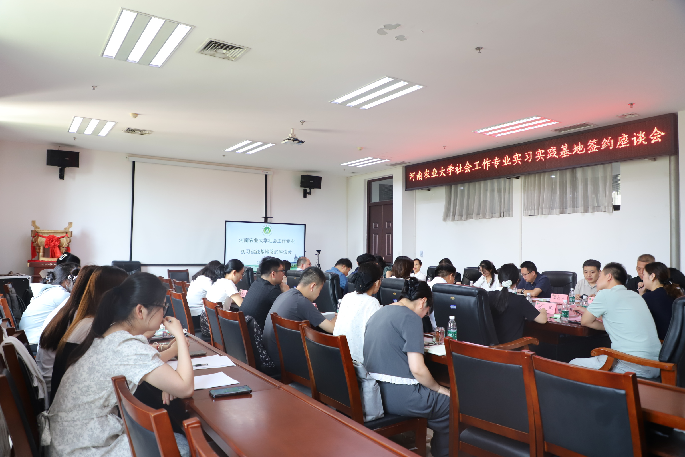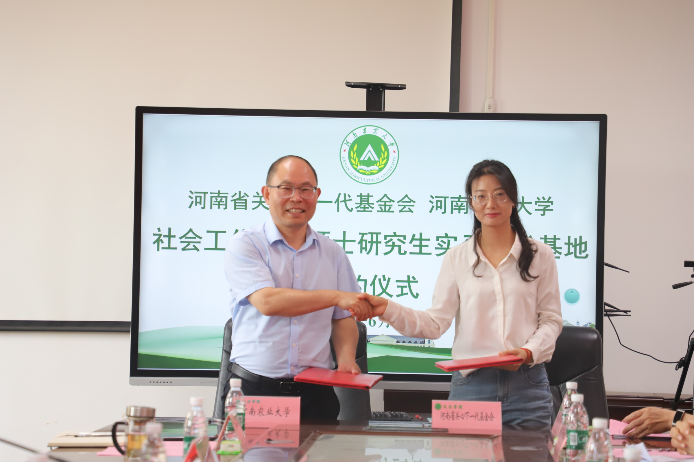 在A310会议室举办社会工作专业硕士研究生实习实践基地签约座谈会。河南省关心下一代基金会副理事长、秘书长陈孟华,项目部主管汪玉;河南省荣康医院副院长陈四军、精神康复医学科副主任郭丁业;三门峡市卢氏县委常委、政法委书记孙丽松,社会工作部部长张书锋;郑州市经开区明湖办事处党工委副书记王红杰,党工委委员、副主任王锡坤,亚太社区书记范晓静;郑州市郑东新区全人社会工作服务中心理事长张丹、总干事陈智燕受邀到会。河南农业大学研究生院院长宋安东、教务处副处长王金铎、91porn