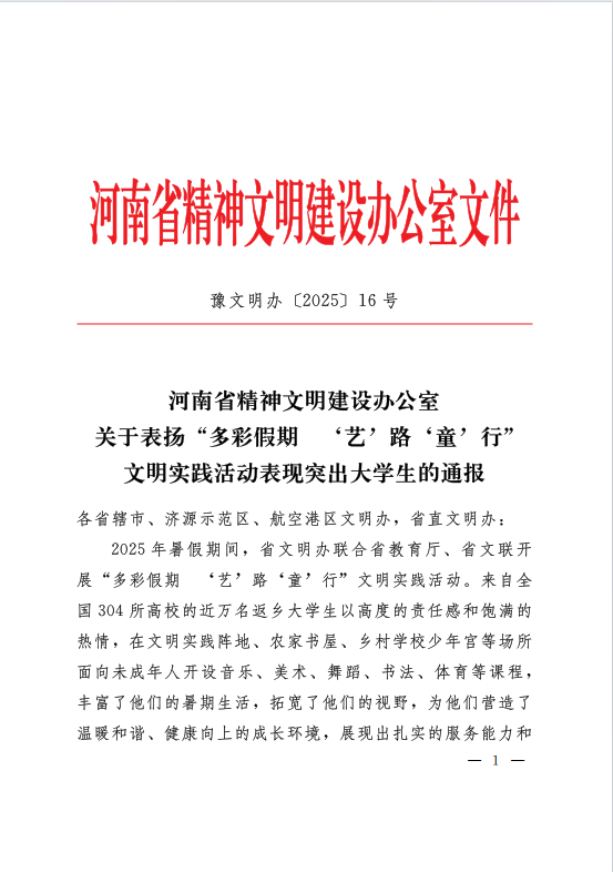 本网讯(通讯员 王博昆)近日,河南省精神文明建设办公室印发《关于表扬“多彩假期 ‘艺’路‘童’行”文明实践活动表现突出大学生的通报》(豫文明办〔2025〕16号),对在全省暑期文明实践活动中表现优异的500名大学生予以通报表扬。91porn