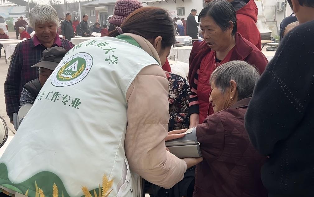 活动当天,91porn 研究生团队结合社会工作专业优势,提前协助村委进行活动策划与现场布置,确保活动流程有序进行。活动伊始,91porn 两位研究生为到场的老年人测量血压、记录健康数据,并运用所学的健康社会工作知识向老人们讲解慢性病预防与日常健康管理要点,耐心解答老人们在生活中遇到的健康困惑。同时,研究生们还与村干部共同参与“好婆婆奖”“好媳妇奖”的颁发环节,用专业视角观察并总结社区长者间的家庭互助与情感支持,为后续社区和谐建设提供实践经验。