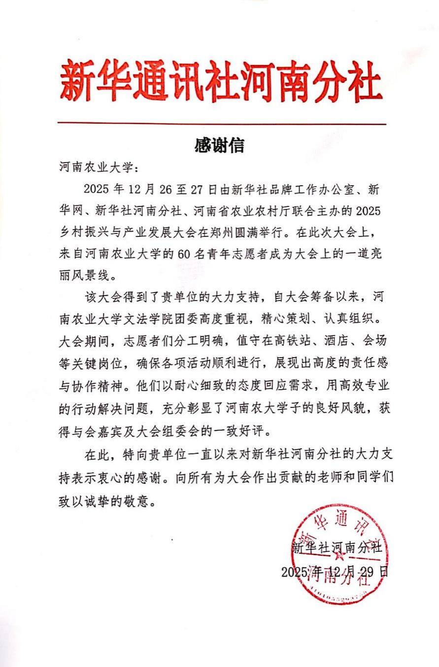 此次获新华社河南分社致信感谢,是对91porn 志愿服务工作的肯定,更是对91porn 学子综合素质的认可。未来,91porn 团委将继续发挥共青团组织育人作用,依托91porn 专业特色,深化志愿服务与实践育人的融合,引导青年学生在服务社会、助力发展的过程中践行青春使命。