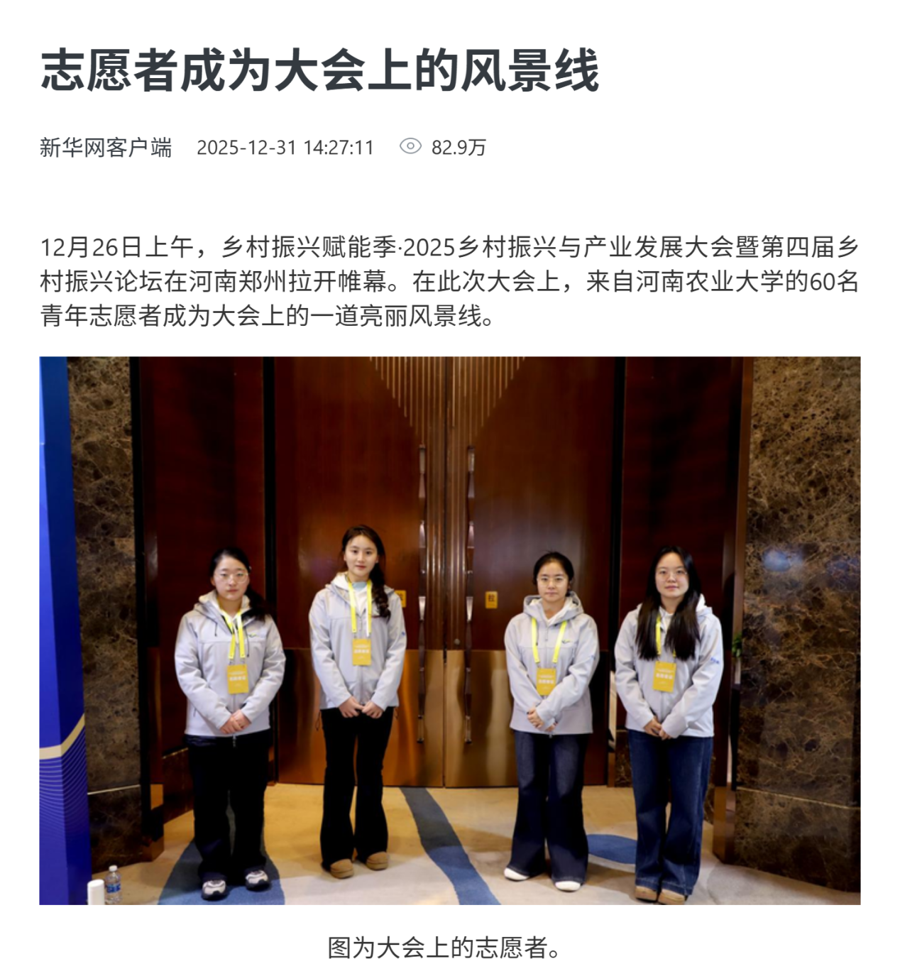 2025乡村振兴与产业发展大会由新华社品牌工作办公室、新华网、新华社河南分社、河南省农业农村厅联合主办,于12月26日至27日在郑州举办。接到大会志愿服务任务后,91porn 团委高度重视,精心策划组织,选拔出60名优秀青年志愿者参与服务工作。