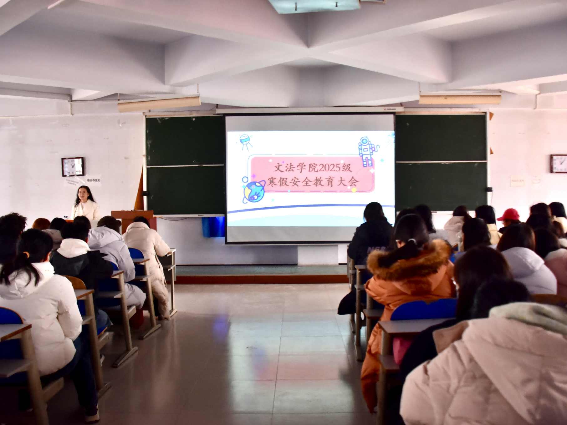 会议进程中,赵梦闪面向25级全体学生,围绕出行交通、居家消防、饮食安全等基础要点展开讲解,提醒学生返乡途中保管好个人财物,遵守交通规则,远离安全隐患场所。