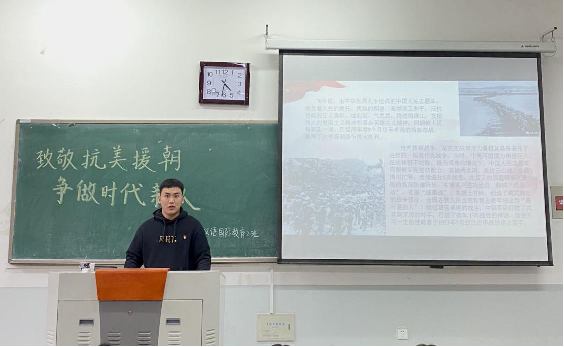 为纪念抗美援朝七十周年,秉持丰富活动形式,帮助学生深层次、全方位、多领域理解和宣传抗美援朝战争光荣历程和伟大胜利的理念,此次团日活动特邀请学生党员代表进行演讲。学生党员代表赵和旺以电影《金刚川》为切入点为学生讲解抗美援朝这段伟大历史事件,同时引入习近平纪念中国人民志愿军抗美援朝出国作战70周年大会的重要讲话展现中华民族奋进新征程的无比坚定、无比自信;学生党员代表王晓钶结合抗美援朝的历史背景,进而阐述纪念抗美援朝战争胜利七十周年的重要意义。