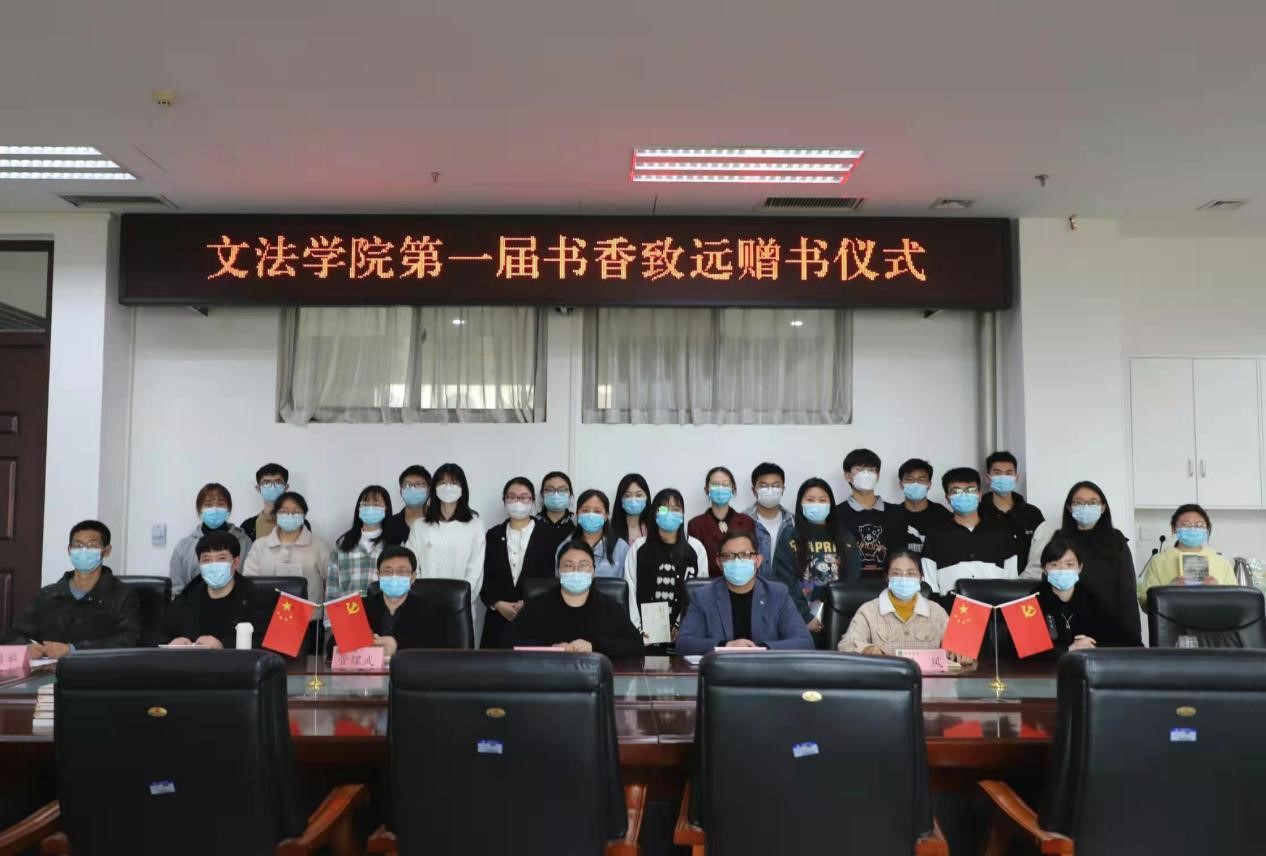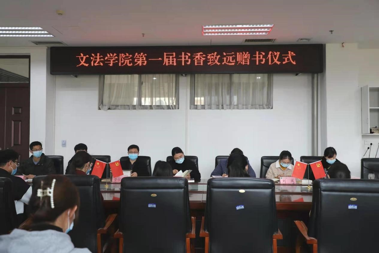 于龙子湖校区教学楼A310会议室举行第一届“书香致远”赠书仪式。院党委副书记余果、法律系主任韩宁、行政管理系主任管煜武、汉语言文学系主任刘华、社会学系副主任刘风,团委书记朱瑞萍出席此次活动,活动由院团委副书记王鹏举主持。