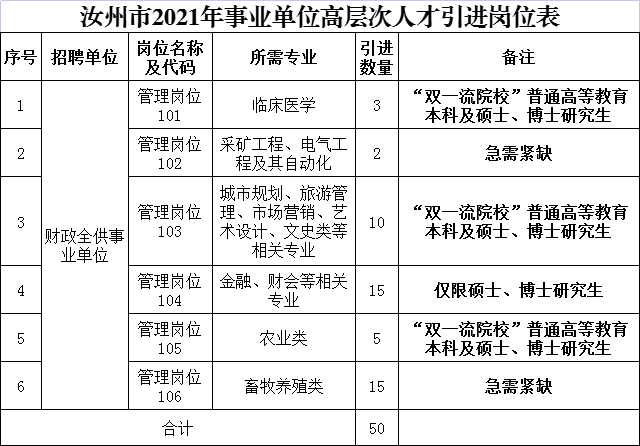 本次事业单位计划引进人才50名,引进岗位专业、数量等详见引进岗位表(附件1)。