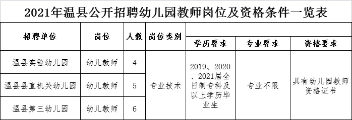本次计划共招聘幼儿园教师15名,其中温县实验幼儿园4名,温县县直机关幼儿园5名,温县第三幼儿园6名。