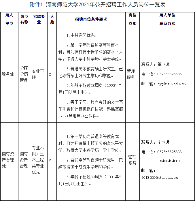 5.岗位所需的专业和其他条件,详见附件1《河南师范大学2021年公开招聘工作人员岗位一览表》。