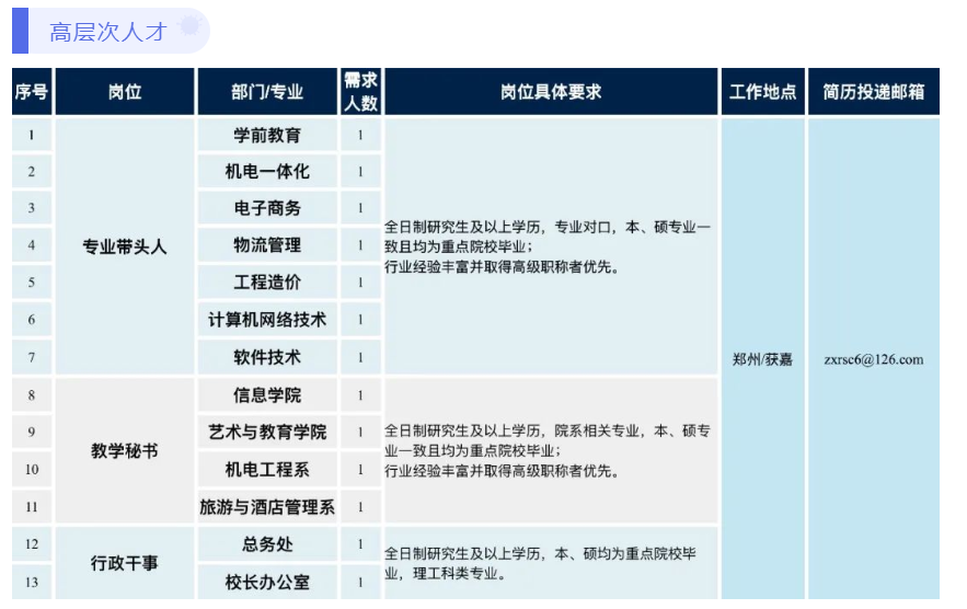 邮件标题请注明XX(应聘部门)—XX(应聘岗位)—XX(专业)—XX(学历)—XX(学校)—XX(姓名),如:信息学院—计算机网络教师—计算机科学与技术—硕士—郑州大学—张三;(备注:高层次人才请注明高层次人才—XX(应聘岗位)—XX(专业)—XX(学历)—XX(学校)—XX(姓名)个人简历应包含学历、工作经历,是否党员、家庭住址、所获荣誉、职称、科研成果、最快上岗时间等情况。