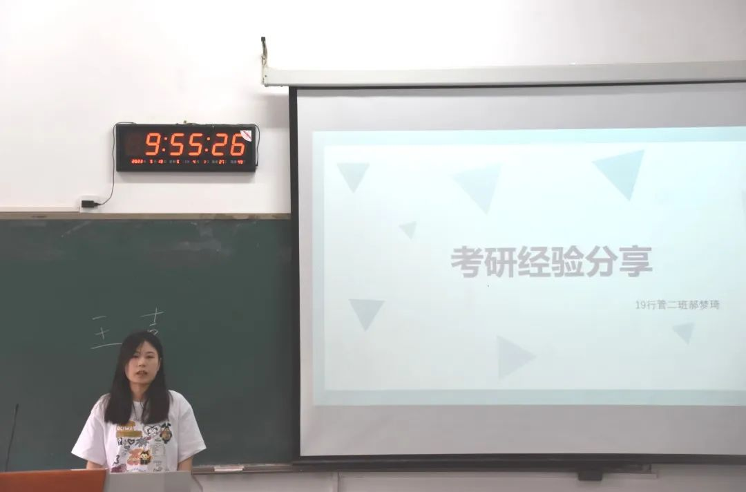 王慧华结合行政管理专业的考研情况,进行了经验分享。她指出,行政管理专业考研人数多,招生名额少,同学们应当做好充足的准备,脚踏实地,认真复习。接着,她从学习、择校、生活三个方面分享了对政治,英语,专业课的学习规划,诠释高效学习的方法。